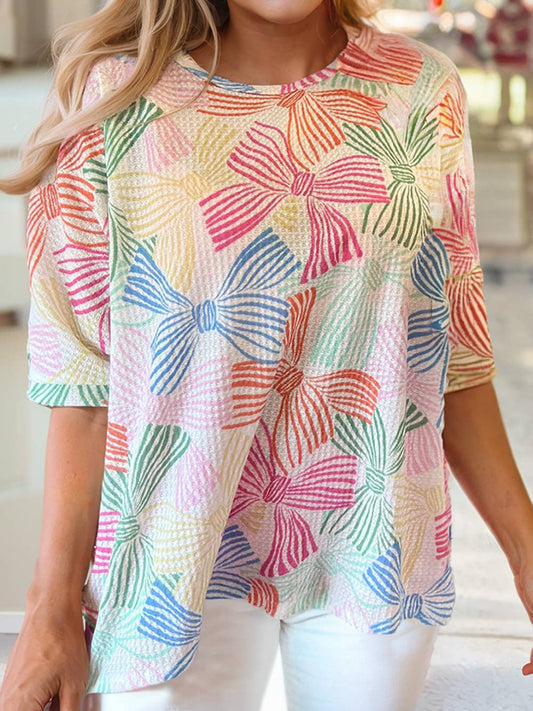 Bowknot Printed Waffle Crewneck Loose Short Sleeve Top